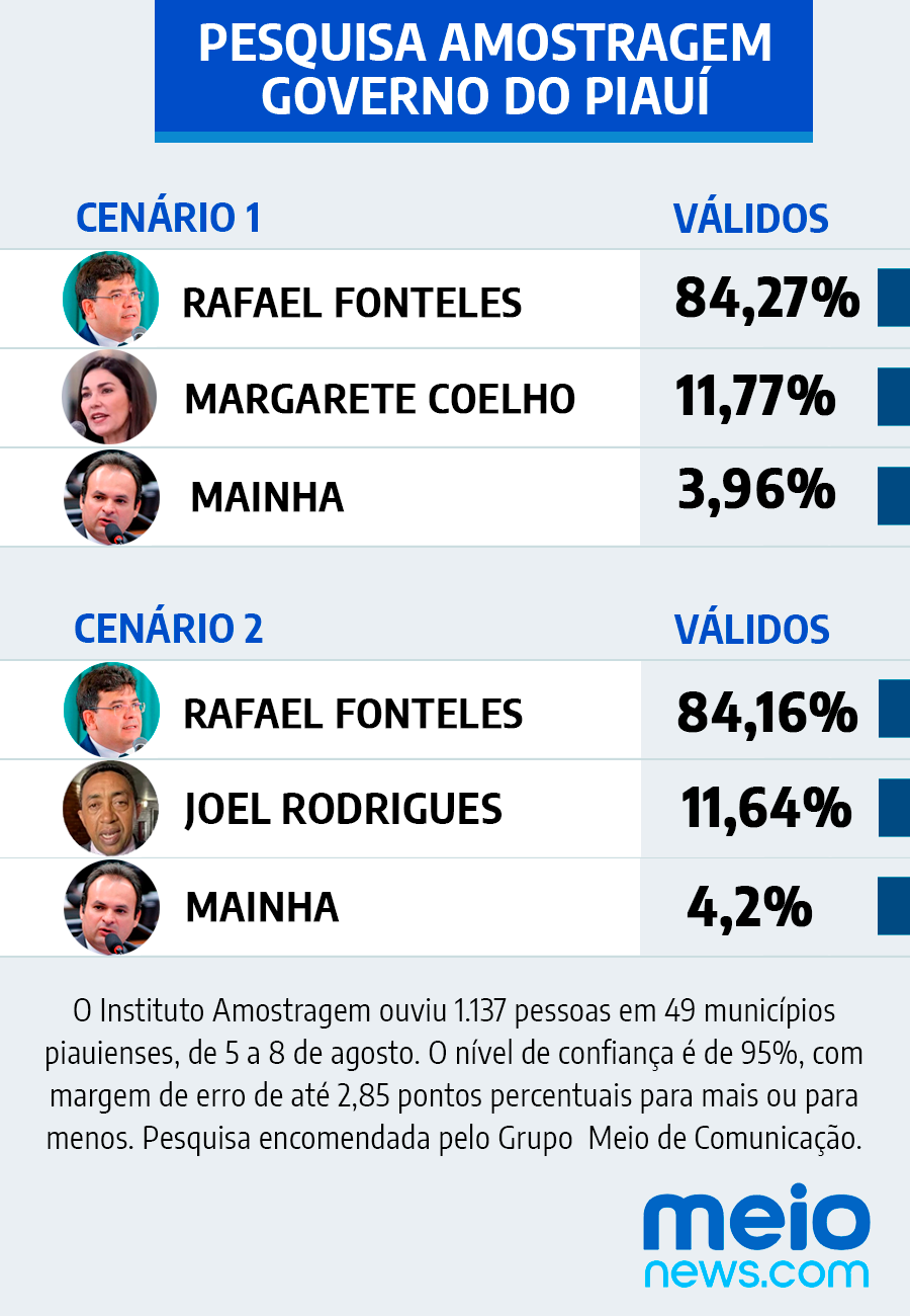 O Instituto Amostragem ouviu 1.137 pessoas em 49 municípios piauienses, no período de 5 a 8 de agosto. A amostra foi definida de forma não aleatória por cotas de sexo, idade, grau de instrução, renda familiar, zona (urbana e rural), microrregiões e municípios.